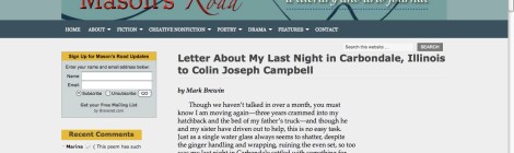 Just published yesterday online, my poem “Letter about my last night in Carbondale, Illinois” is now available on Mason’s Road. Please click the link and check it out.