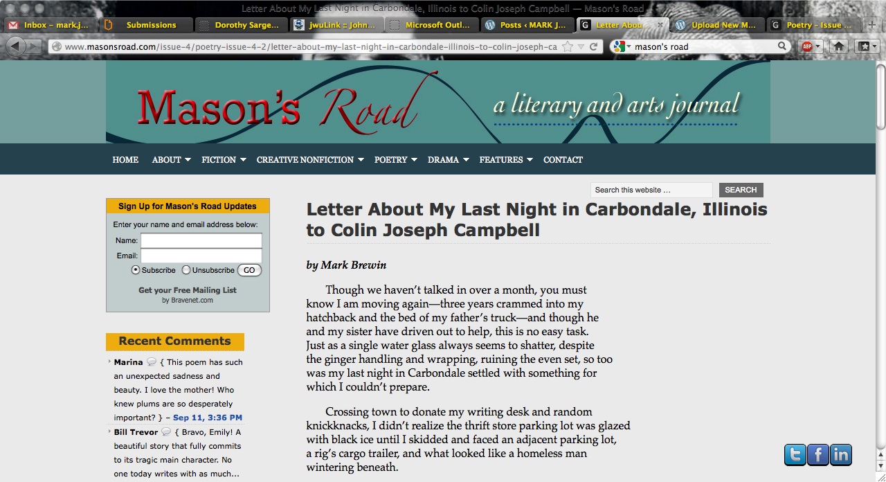 Just published yesterday online, my poem “Letter about my last night in Carbondale, Illinois” is now available on Mason’s Road. Please click the link and check it out.