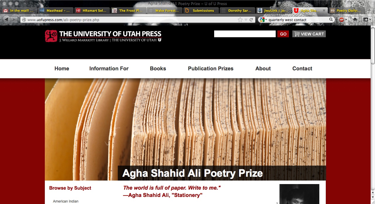 Officially announced at the University of Utah Press website, my first book manuscript was selected as the winner of the 2012 Agha Shahid Ali Poetry Prize by contest judge Kathleen Graber. Besides my collection being published in the spring 2013 catalog, I will receive a cash prize and will give a reading in the University of Utah’s Guest Writers Series.