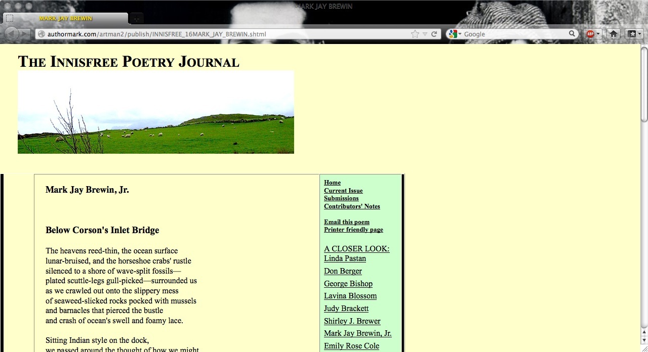 Published online, my poems “Below Corson’s Inlet Bridge” and “Ned Kelly Exiled in New Zealand” can be found in Issue 16 of the Innisfree Poetry Journal. Please click the link and check them out.